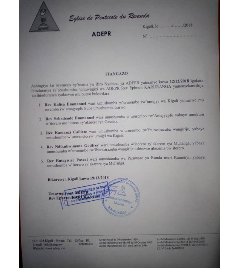 Iri tangazo rivuga ko ADEPR Kuwa 12 Ukuboza 2018, ari bwo Biro nyobozi y’itoreo rya ADEPR mu Rwanda yakoze inama yafatiwemo umwanzuro wo guhinduranya abashumba b’indembo.