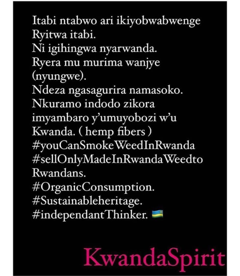 Icyo gihe yagize ati "Mu Rwanda ni cyo gihugu ku Isi kinyemerera kunywa umuti w’itabi ry’urumogi mu ruhame no mu busitani bwa Kigali nta nkomyi."