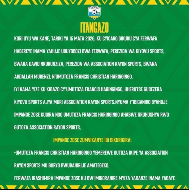 Mu itangazo FERWAFA yasohoye yavuze ko uyu munsi tariki ya 16 Mata 2026 ku cyicaro gikuru cya FERWAFA habereye inama yahuje abayobozi tumaze kuvuga hejuru yiga ku kibazo cy’umutoza Haringingo Francis uheruka gusezera Kiyovu Sports akajya muri Rayon Sports.