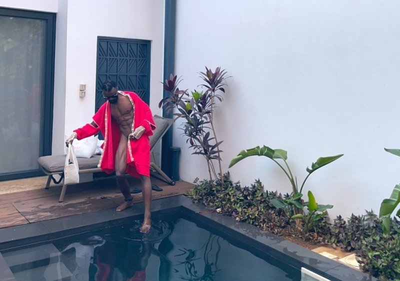 Aya mafoto ni amafoto abiri, bigaragara ko yafashwe arimo yinjira muri pisine indi ifatwa umuntu amuturutse inyuma avuye muri pisine yambaye ubusa buri buri.