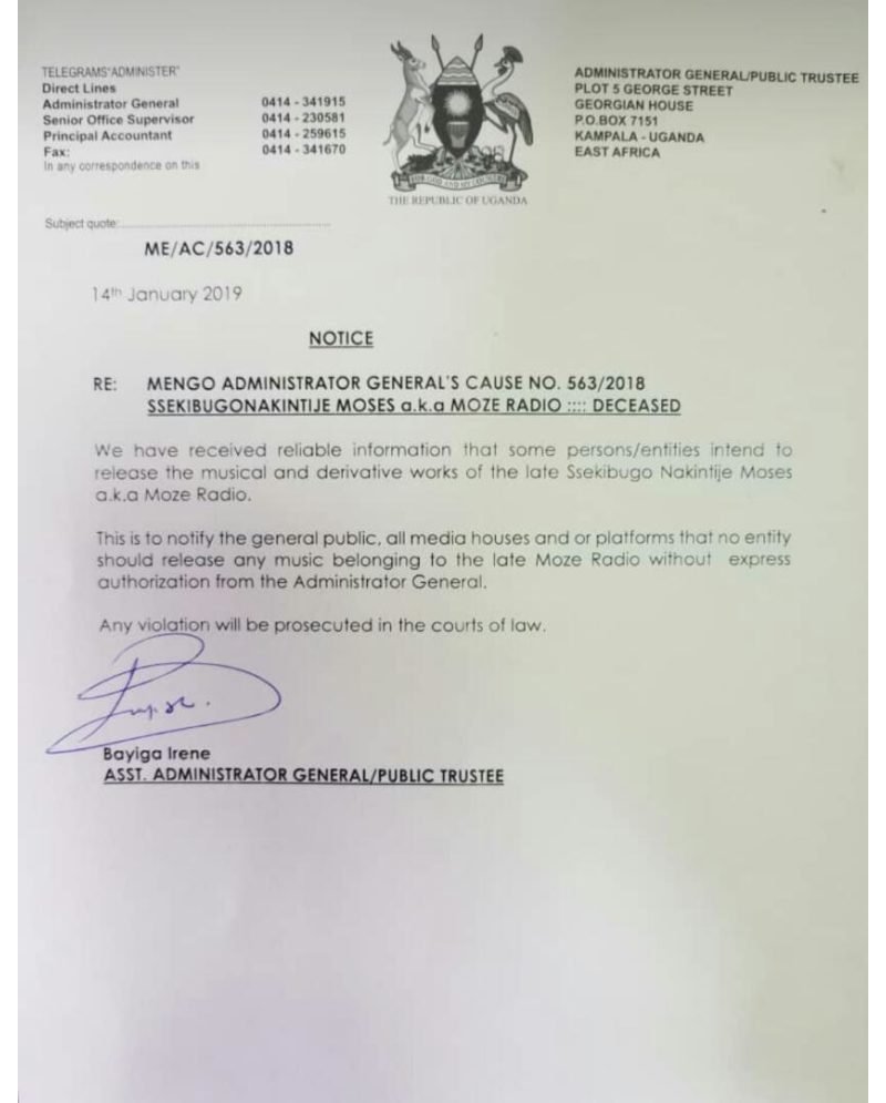 Bayiga Irene wasinye abaruwa ihagarika iki gitaramo hari aho agira ati “Turamenyesha abantu bose, ibitangazamakuru ndetse n’abandi bose ko nta muntu wemerewe gusohora indirimbo ya nyakwigendera Mowzey Radio atabiherewe uburenganzira.”